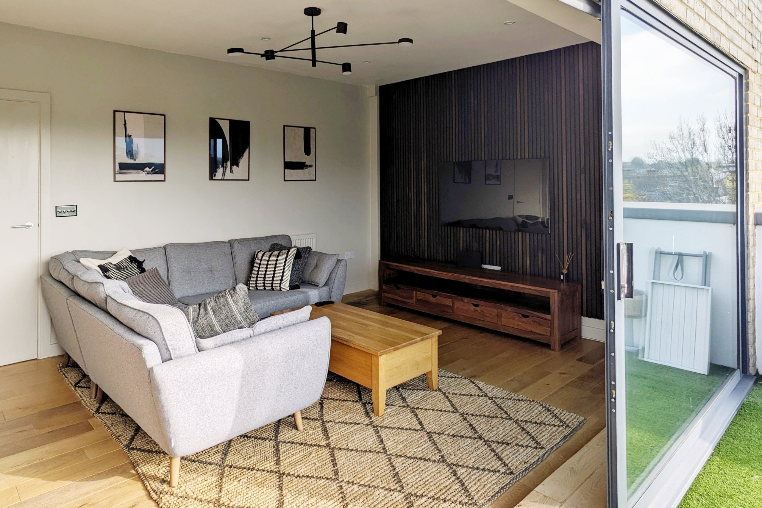It has an open-plan living area with sofa bed and dining for four.