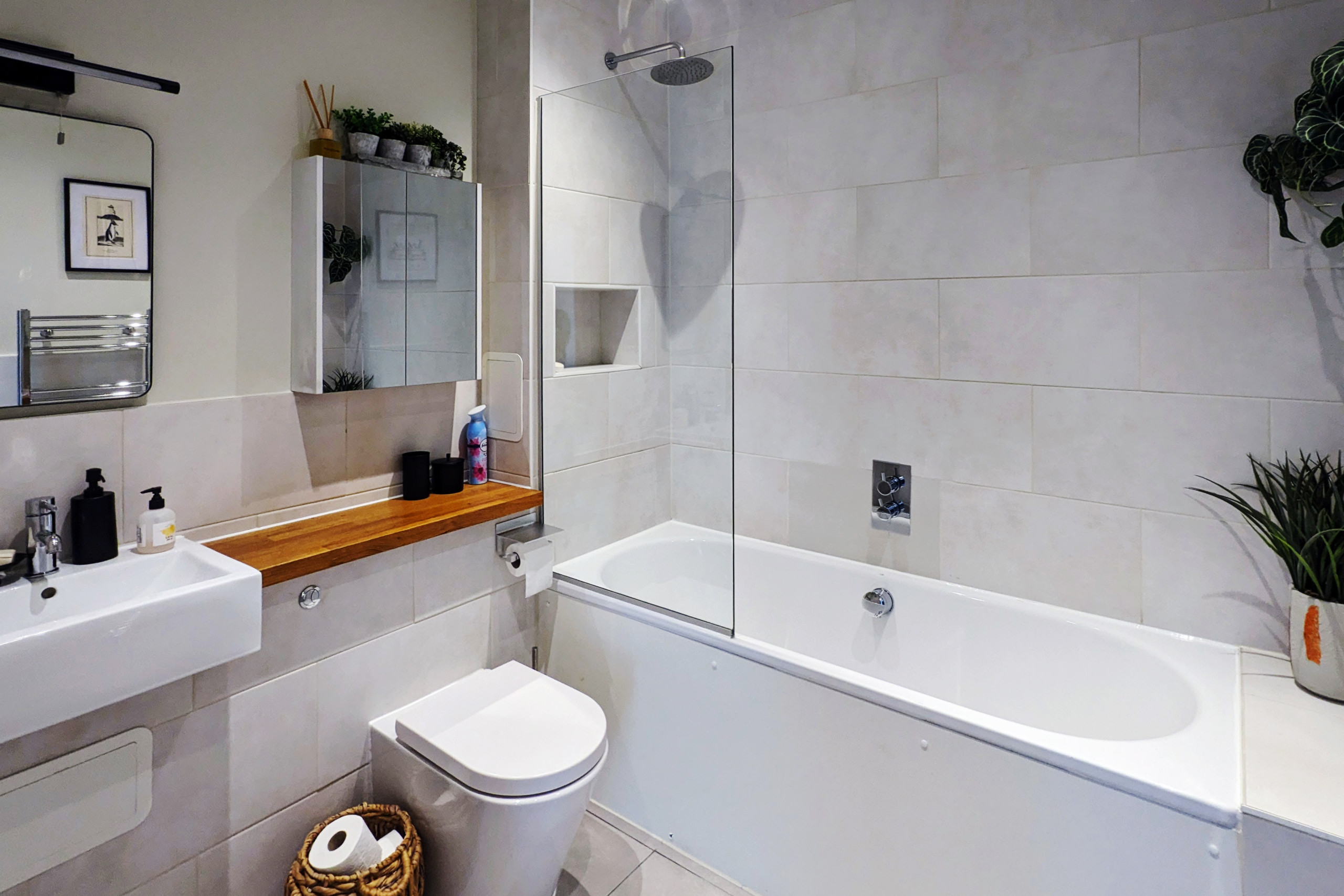 The bathroom has a full-sized bath with a fitted thermostatic shower over it.